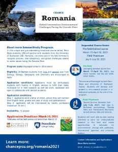 Universitatea din București și ICUB, în colaborare cu Penn State University, invită studenții pasionați de la ciclul de licență, din anul I și II, specializările Ecologie, Biologie, Geografie și Chimie să aplice la un program de cercetare binațional alături de studenți americani. Programul cuprinde 7 săptămâni de cursuri și workshop-uri online susținute de cercetători consacrați și o cercetare de teren de 3 săptămâni, în București, Delta Dunării și Piatra Craiului. Studenții vor avea ocazia să genereze și să testeze propriile ipoteze de lucru și să lucreze împreună cu studenții din SUA, în laboratoarele de cercetare ale UB, alături de mentorii implicați în acest curs. Pentru acest program, care reprezintă o premieră națională, ICUB și UB oferă 12 locuri gratuite pentru studenții care vor fi selectați. Aplicațiile constau într-o scrisoare de intenție care va fi trimisă pe adresa chance_ro_sua@unibuc.ro până cel târziu la data de 10 martie 2021, în care trebuie menționate obligatoriu specializarea, notele obținute la disciplinele parcurse până în prezent și nivelul de cunoaștere a limbii engleze.