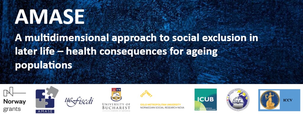 The current conference is organized by the project members of the AMASE project, A multidimensional approach of social exclusion in later life-health consequences for ageing populations, funded through the Norway Grants 2014–2021. The conference is supported by the Research Institute of the University of Bucharest, NOVA – Oslo Metropolitan University, National Research Institute for Labour & Social Protection and the Research Institute for Quality of Life – Romanian Academy. Presentations concentrate on explanatory factors of social exclusion in old age, consequences of the phenomenon, and analyses of existing policies. Single country studies, comparative analyses across various societies, as well as cross-sectional and longitudinal approaches are included.