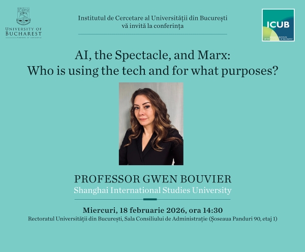 On Wednesday, 18 February 2026, the Research Institute of the University of Bucharest (ICUB) invites you to the presentation “AI, the Spectacle, and Marx: Who is using the tech and for what purposes?”, delivered by Professor Gwen Bouvier, from the Shanghai International Studies University.