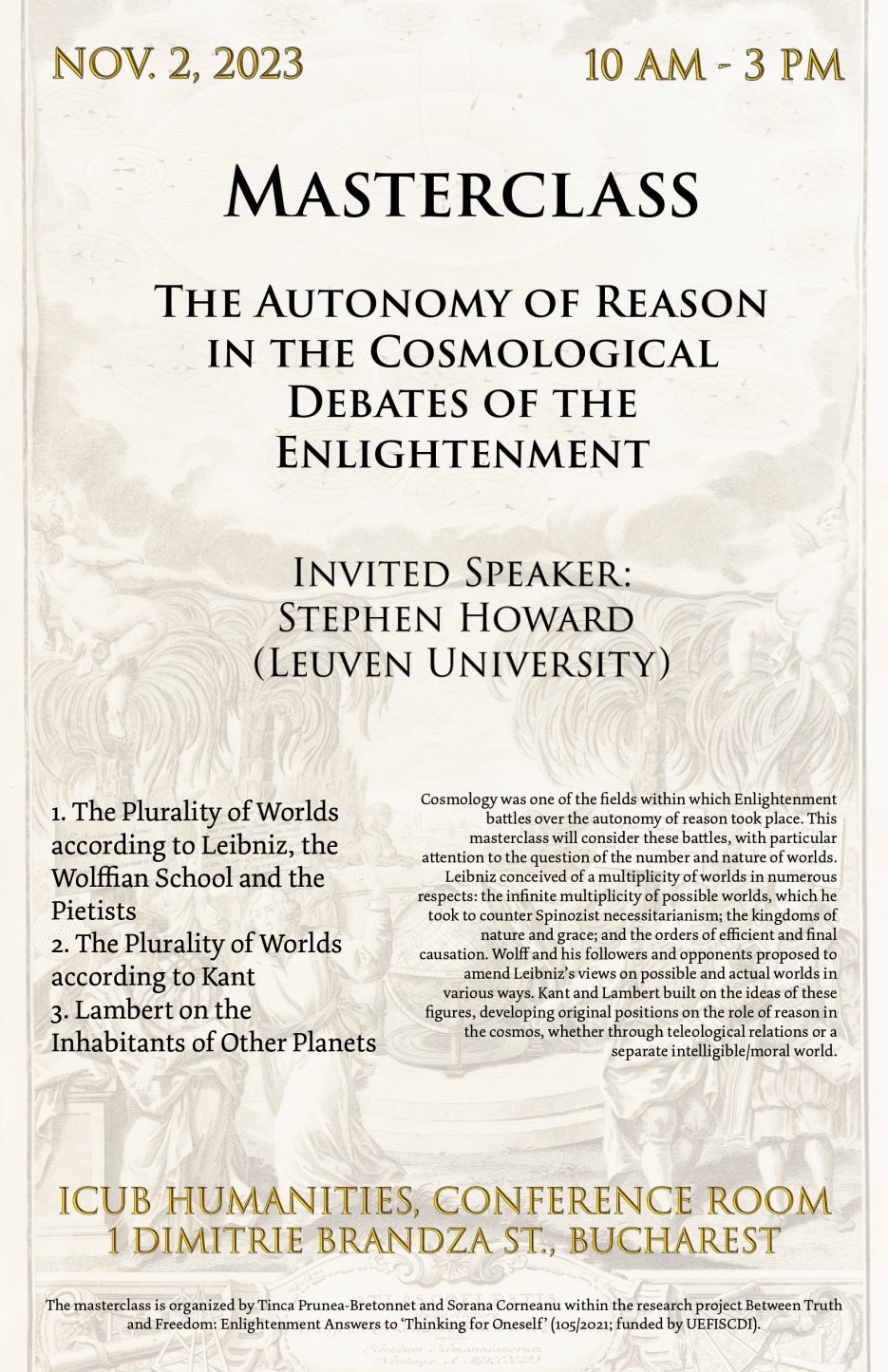 The masterclass is organized by Tinca Prunea-Bretonnet and Sorana Corneanu within the research project Between Truth and Freedom: Enlightenment Answers to ‘Thinking for Oneself’ (105/2021; funded by UEFISCDI).