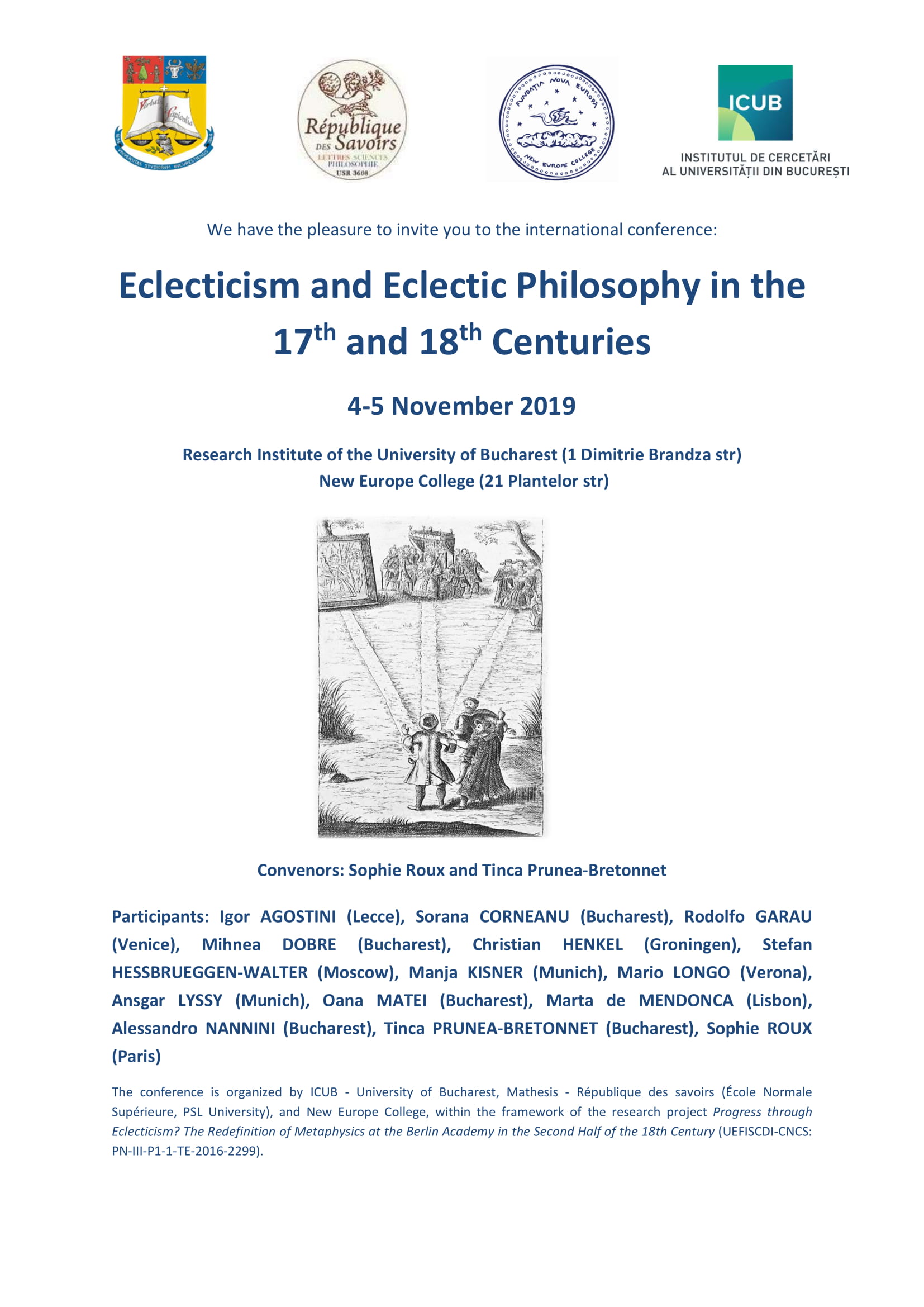 The conference aims to address (but is not limited to) the following questions: What is the relation between eclecticism, skepticism, and dogmatism? Is eclectic philosophy incompatible with systematic philosophy? How does eclectic philosophy relate to syncretism? Does the natural philosopher have to be an eclectic thinker? How do specific eclectic thinkers elaborate their perspectives? Can the eclectic method be applied to metaphysics? Can we speak of several types of eclecticism (Donini) or advocate a significant difference between the understandings of the term in the seventeenth and eighteenth centuries (Billard)? Is there a specific eclectic philosophy promoted by the Berlin Academy? Does Kant’s condemnation of eclecticism discard the eclectic art of philosophizing altogether or does it take up central eclectic elements under a different name (Hinske)? What is Cousin’s original contribution to eclectic philosophy?