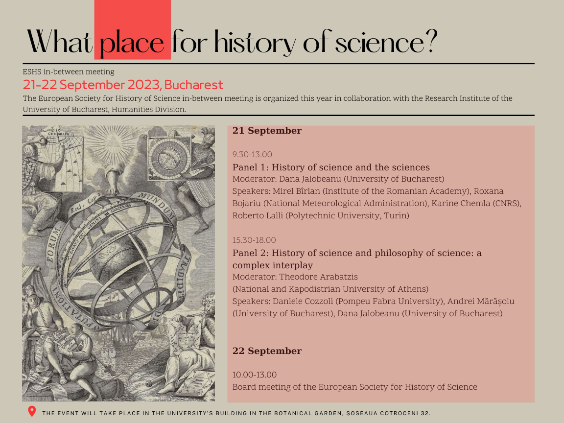 The European Society for History of Science in-between meeting is organized this year in collaboration with the Research Institute of the University of Bucharest, Humanities Division. This meeting is a tradition of ESHS, bringing together members of the board and the organizers of next year’s conference and combining the discussion of ESHS matters with scientific presentations and reflections upon the profession. This year’s meeting is dedicated to a large, actual and pressing question: What is the place of the history of science in our contemporary society? How does HS stand among other disciplines for the production of knowledge? We have invited to our meeting scientists, philosophers and historians to reflect together on these questions.